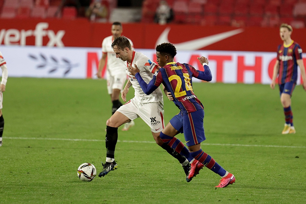 Durch die Verletzungsmisere der vergangenen Tage und Wochen war Ronald Koeman erneut dazu gezwungen, in der Viererkette umzustellen. Vor allem die rechte Hälfte der Abwehr wurde in Sevilla daher zu einem Experiment: Oscar Mingueza, zuletzt immer als Rechtsverteidiger eingesetzt, übernahm den Posten des rechten Innenverteidigers, während Linksfuß Junior Firpo als Aushilfe auf der Außenverteidigerposition einsprang.