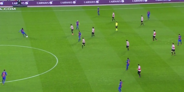 Athletic Bilbao zeigte in der ersten Halbzeit ein starkes Defensivspiel. Die Abwehrreihe der Basken stand hoch, sodass man auf eine Abseitsfalle gesetzt hat, die überaus effektiv war. Weiterhin standen regelmäßig die Defensiv- und Mittelfeldketten dicht beieinander. In der Rückwärtsbewegung war ein 4-4-2 zu sehen. Gelang der FC Barcelona in die Hälfte der Basken, rückte ein Mittelfeldspieler je nach Spielverlagerung in die Abwehrkette, sodass ein 5-3-2 zu sehen war, mit dem man versuchte, das Durchbrechen in den Strafraum zu verhindern. Nur zweimal stimmte die Zuordnung nicht. Beim ersten Mal war es eine große Lücke zwischen Rechts- und Innenverteidiger, welche es Iniesta ermöglichte, Neymar den Ball zuzuspielen. Das anschließende Tor wurde fälschlicherweise wegen einer angeblichen Abseitsstellung nicht gegeben. Beim zweiten Mal war es wieder eine schlechte Zuordnung sowie eine schlechtere Zweikampfführung, wobei man sich die Frage stellen muss, ob Zweikampf das richtige Wort ist. Messi wird im Mittelfeld von drei Spielern quasi umzingelt, kann sich dennoch durchsetzen. Er schickt den durchstartenden Neymar, der flanken kann. Luis Suárez kommt frei zum Torabschluss und schon fällt das 1:0.